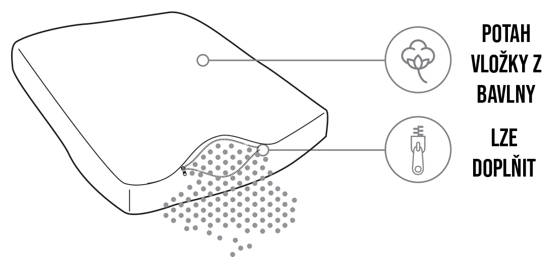Výplň tvoří směs 70 % silikonových kuliček a 30 % drcené pěny. Tato kombinace zaručuje ideální měkkost, pružnost a vzdušnost – pelíšek se neproleží a poskytuje optimální podporu páteři. Díky dobré cirkulaci vzduchu se matrace skvěle hodí do každého ročního období.